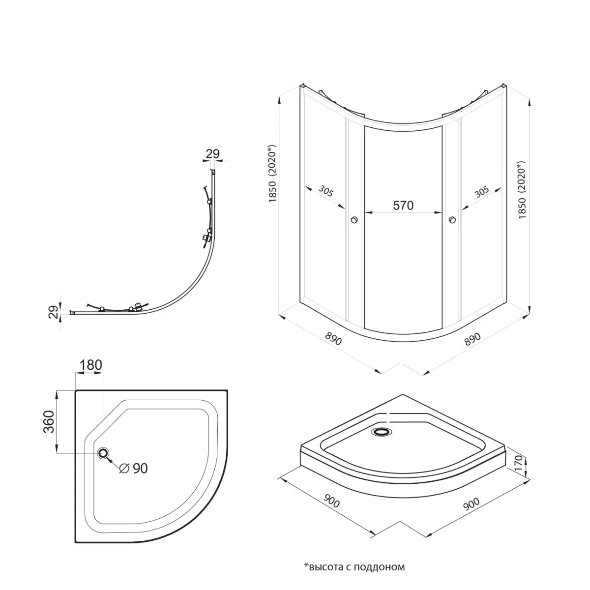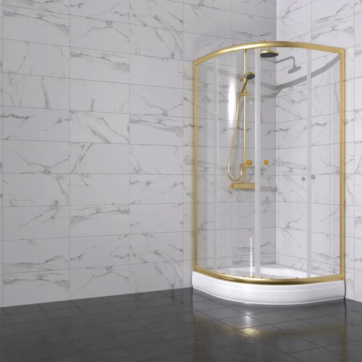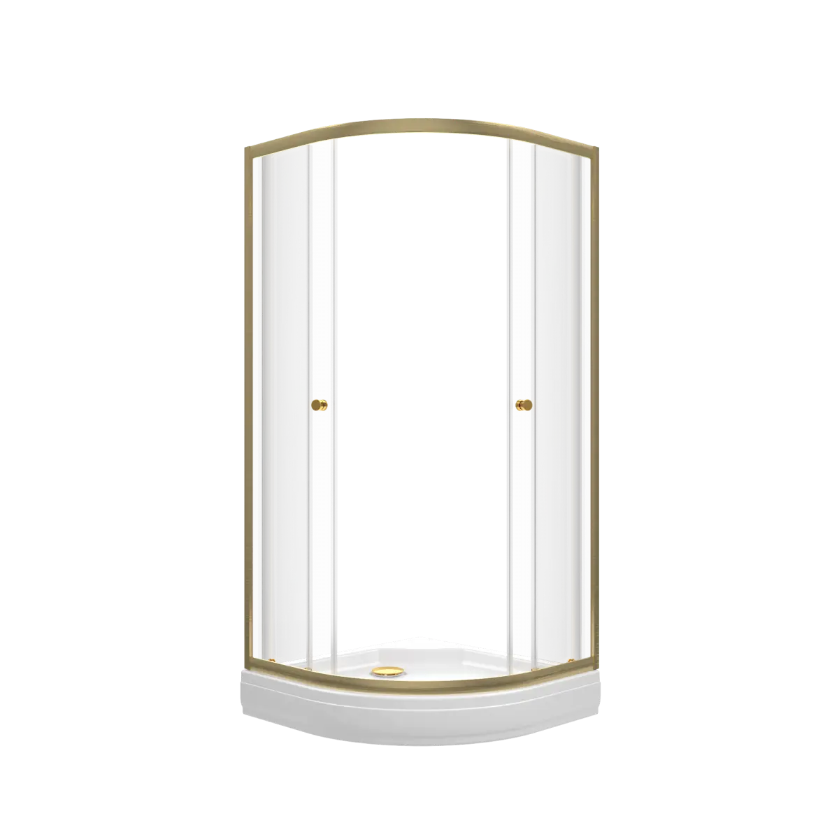 Душевое ограждение с низким акриловым поддоном 90*90см, сифон в комплекте. Цвет профиля - "золото", материал - алюминий. Двери - раздвижные. Макс.нагрузка 350кг.